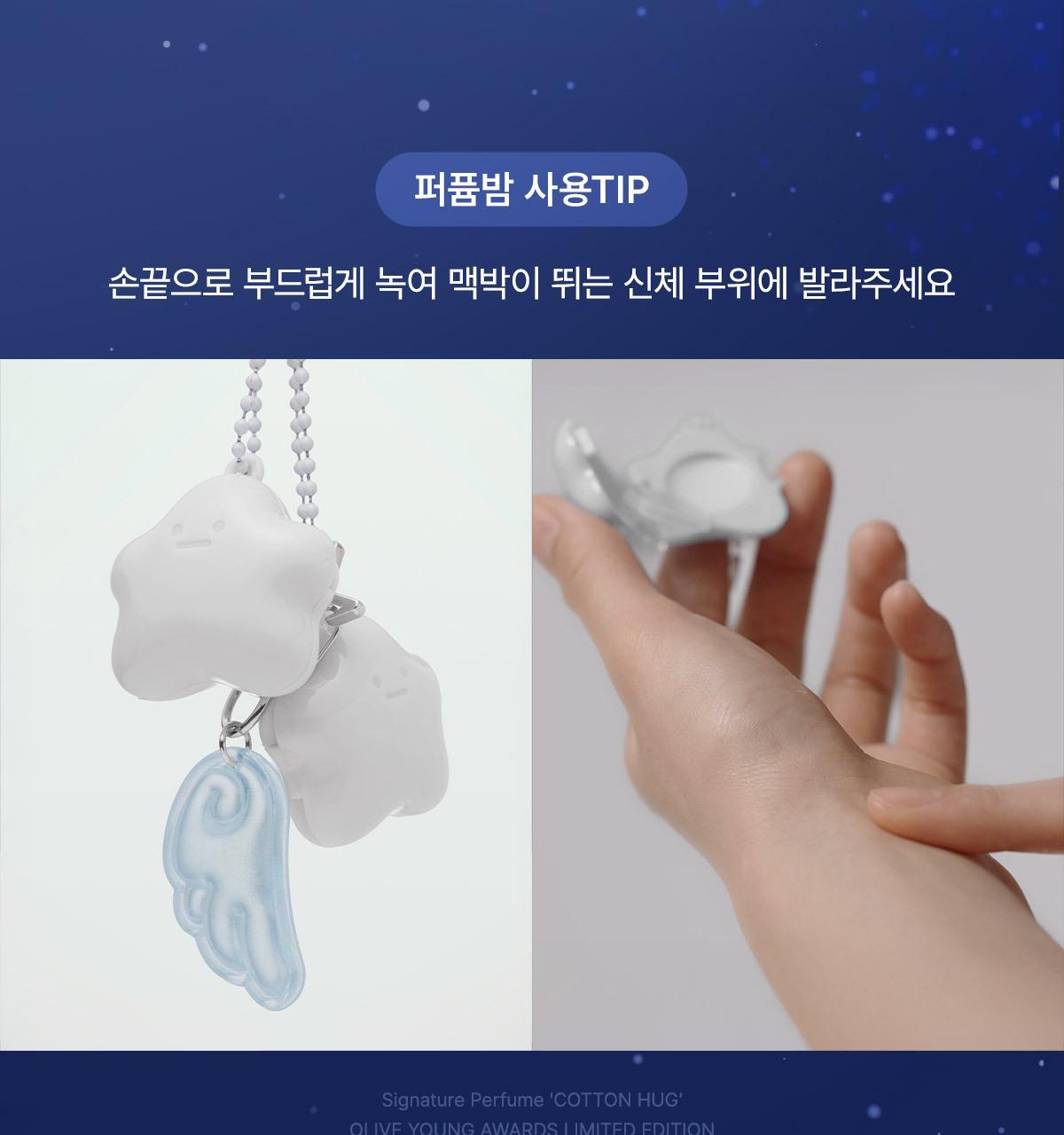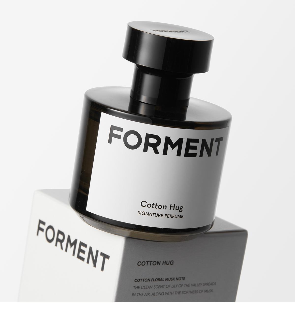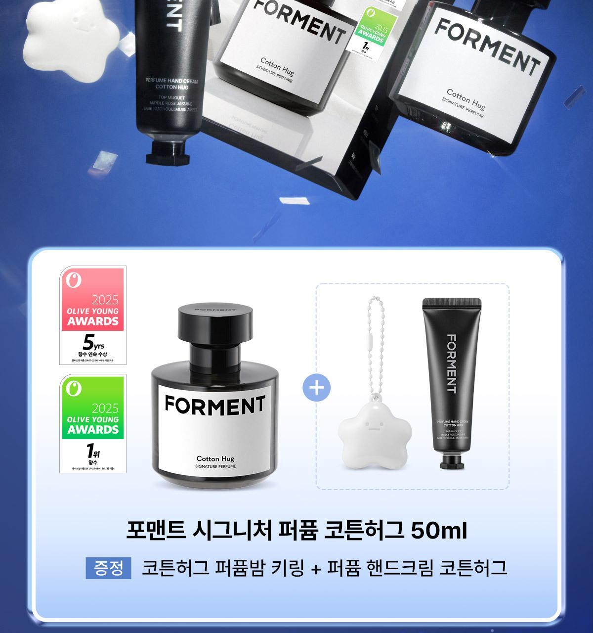 Forment 簽名香水 Cotton Hug,以柔和清新的棉花香氣為靈感,帶來溫暖安心的氛圍。此款 50ml 香水為 Olive Young「Awards 特別企劃」限量套裝,內含香氛膏鑰匙圈與護手霜,讓你隨時隨地保持迷人香氣與細緻手感。