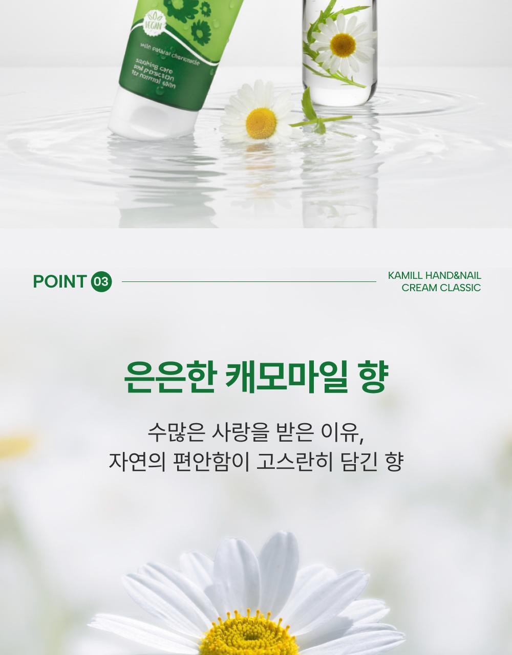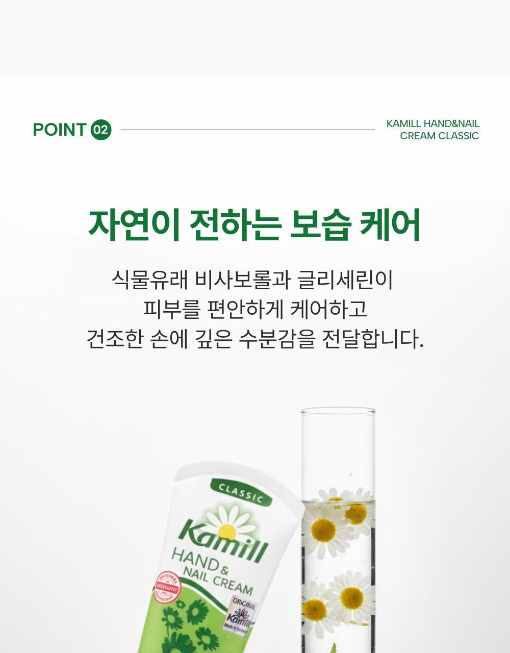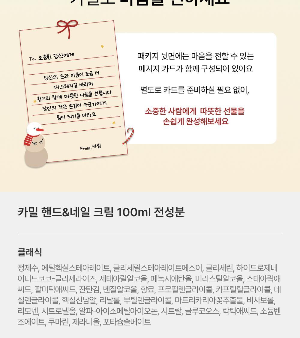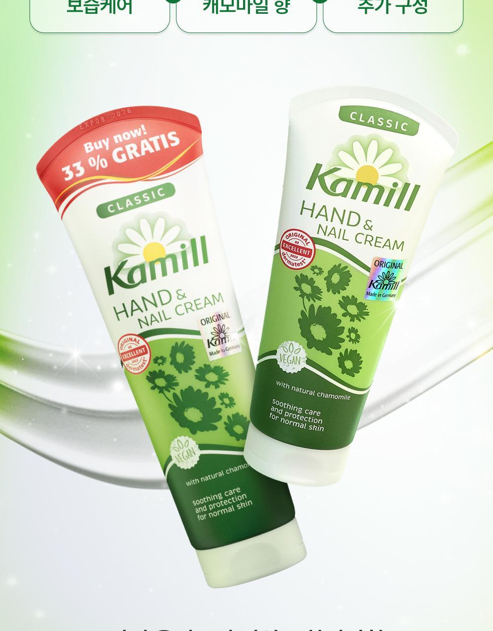 Kamill 經典護手護甲霜,德國經典配方,蘊含洋甘菊萃取與滋養成分,能深層滋潤雙手並修護指甲周圍乾燥肌膚。質地清爽不黏膩,吸收迅速,使用後雙手柔嫩光滑。此款為 Olive Young「Awards 特別企劃」限量套裝,容量升級至133ml,提供更持久的呵護。