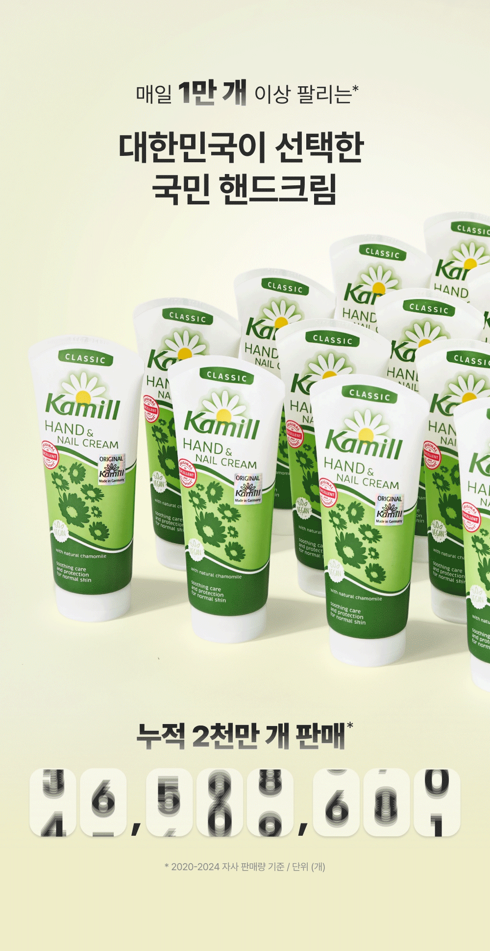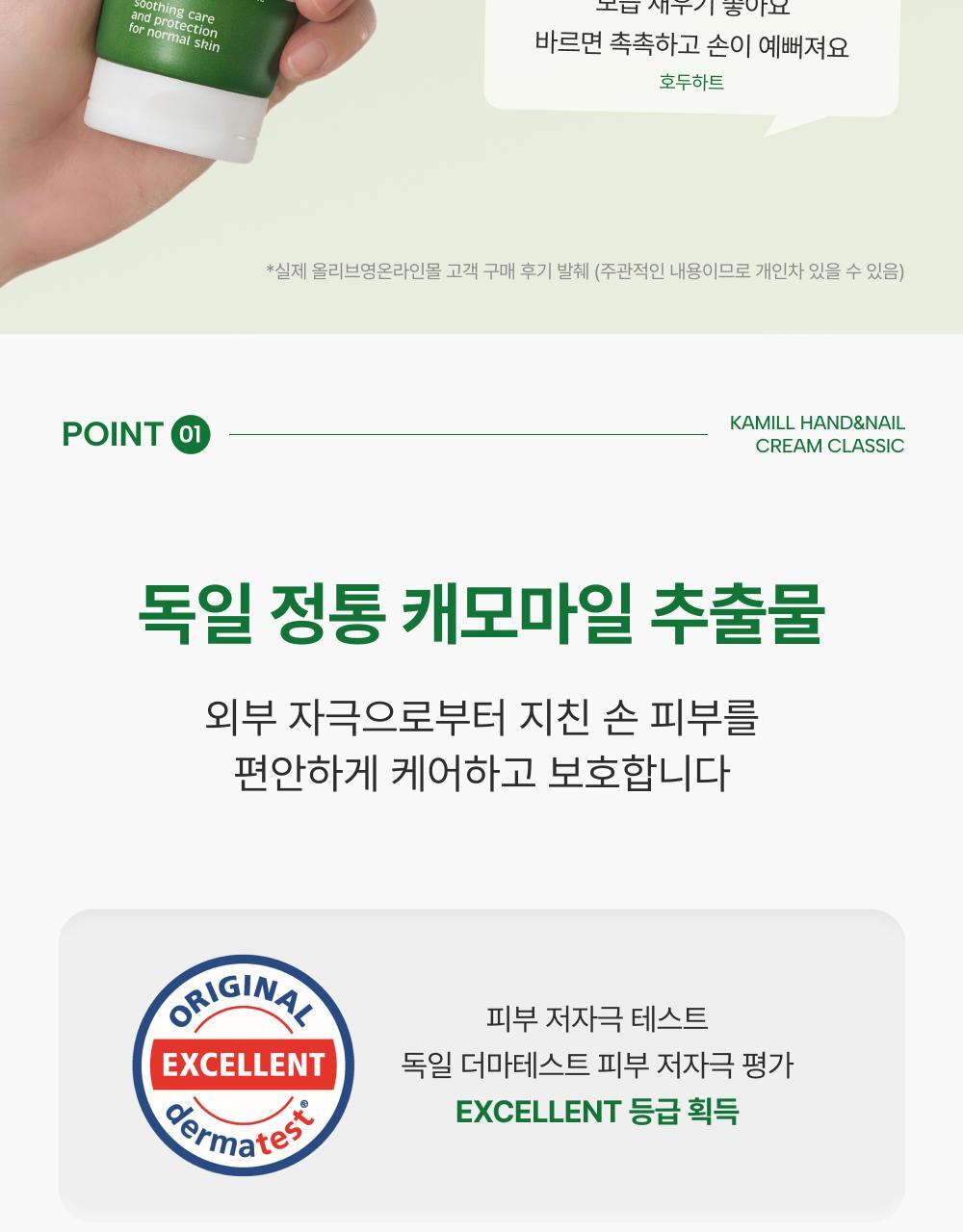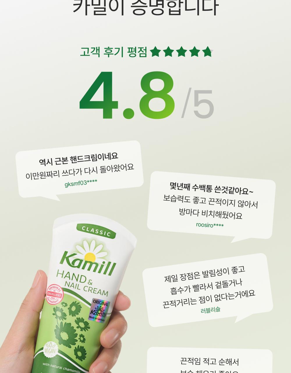 Kamill 經典護手護甲霜,德國經典配方,蘊含洋甘菊萃取與滋養成分,能深層滋潤雙手並修護指甲周圍乾燥肌膚。質地清爽不黏膩,吸收迅速,使用後雙手柔嫩光滑。此款為 Olive Young「Awards 特別企劃」限量套裝,容量升級至133ml,提供更持久的呵護。